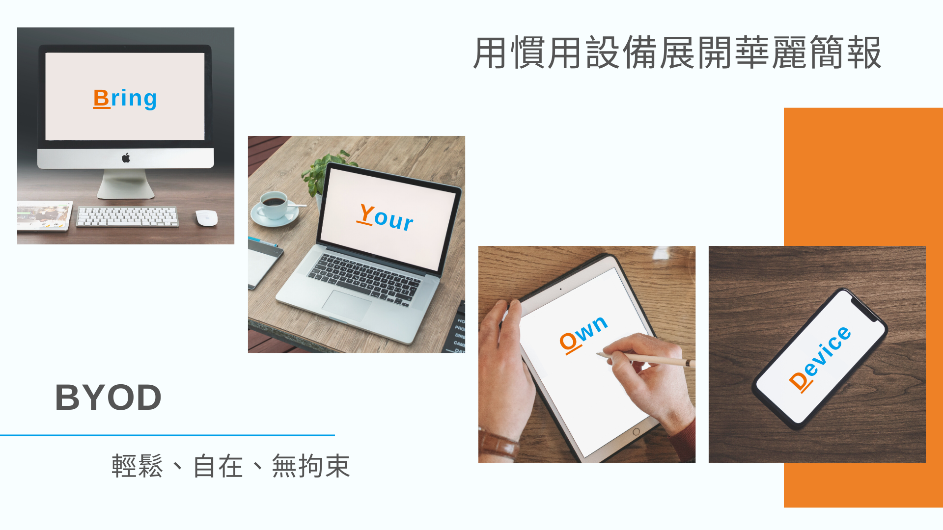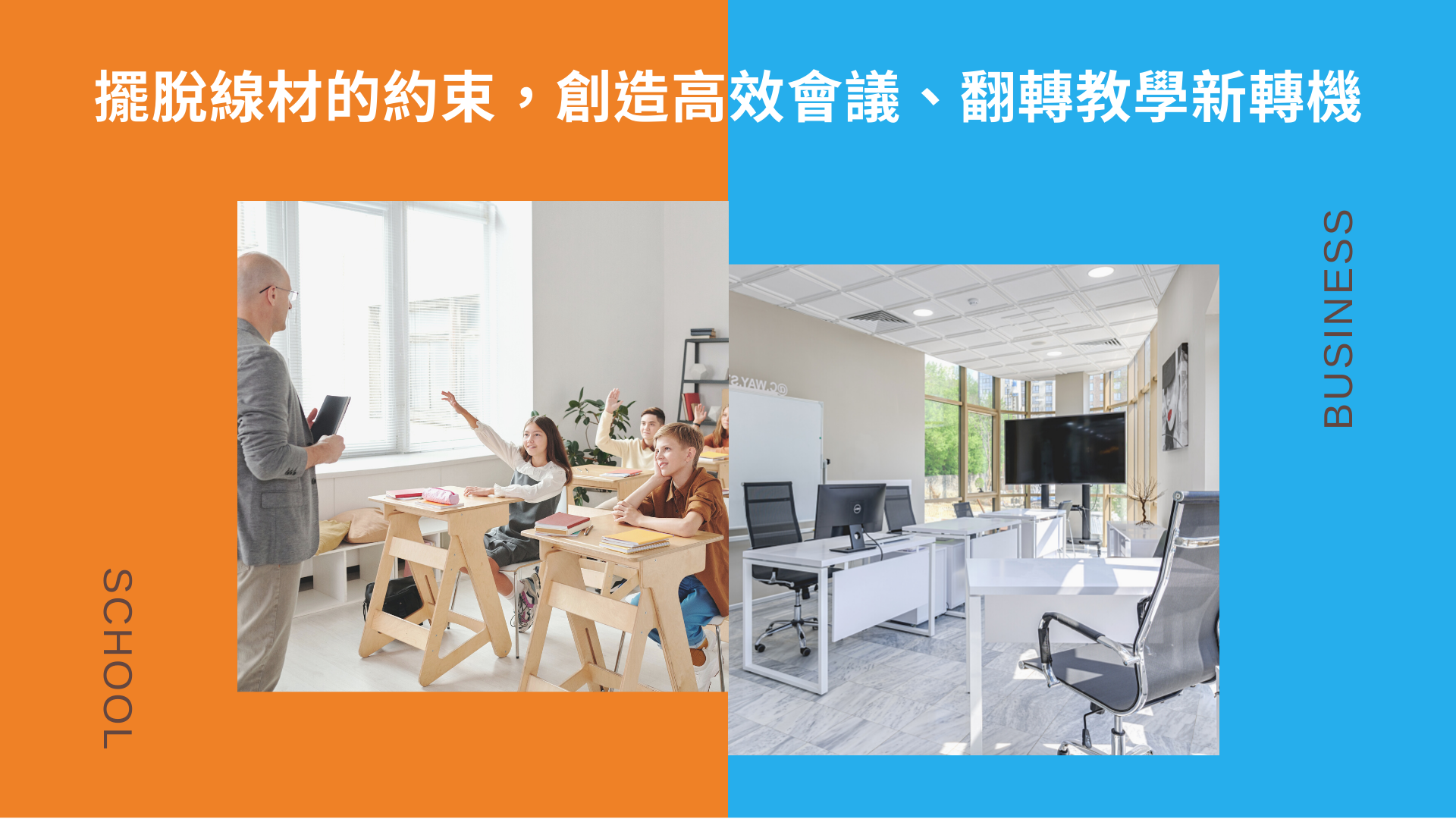 無線投影為迎桀科技主要商品之一,圖片配色環繞著迎桀Logo配色:橘色及藍色,上圖以顏色區別兩個不同的場域,而下圖為展現無線投影BYOD的特點。